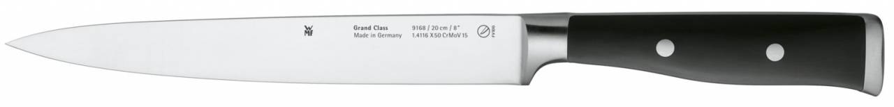 Dotek nostalgie spojený s nejmodernějším zpracováním – to shrnuje řada WMF Grand Class. Design rukojetí s nýty z nerezové oceli připomíná tradiční řemeslné zpracování z minulosti a zaručuje optimální hygienu, ergonomický tvar pak pohodlnou a bezpečnou manipulaci. Podpěra slouží k ochraně prstů při krájení. Stejně jako všechny WMF nože jsou i nože řady Grand Class vyrobeny ze speciální nerezové oceli, kované po celé její délce. Technologie Performance Cut poskytuje čepelím výjimečnou, dlouhodobou ostrost.